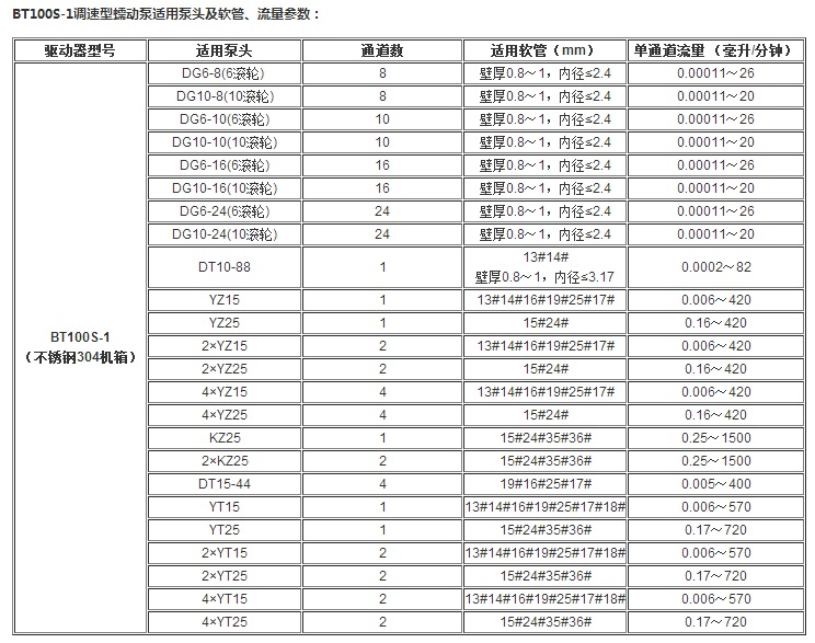 BT100S-1调速型蠕动泵流量范围0.00016~1500毫升/分钟;工作转速0.1-150转/分钟;具有正反,启停,全速(清洗),调速等基本功能外,另外还可通过“简易分装键”实现定时定量输送液体的功能。在RS485通讯中,因为采用了MODBUS协议,更易于与其他控制设备如计算机,人机界面,PLC等连接。