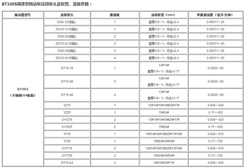 BT100S调速型蠕动泵流量范围0.00011~720毫升/分钟;工作转速0.1-150转/分钟;专用的LF-LCD-OS软件系统,中英文显示,简单方便;具有转速调节,正反,启停,全速(清洗)等基本功能;专用的“简易分装键”,功能强大,可实现定时定量,连续分装,流量测试等功能。