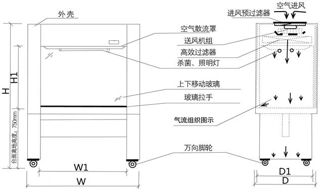5、垂直准闭合式台面,操作室下降流气幕的形成,可有效防止外部气体投入和操作区洁净