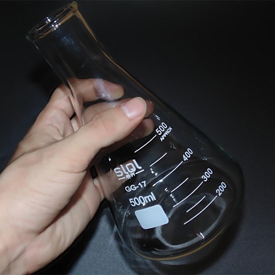 锥形瓶(beakerflask)一种化学实验室常见的玻璃仪器。是硬质玻璃制成的纵剖面呈三角形状的滴定反应器。口小、底大,有利于滴定过程进行振荡时,反应充分而液体不易溅出。该容器可以在水浴或电炉上加热。外观呈平底圆锥状,下阔上狭,有一圆柱形颈部,上方有一较颈部阔的开口,有时可用由软木或橡胶制作成的塞子封闭。瓶身上多有数个刻度,以标示所能盛载的容量。