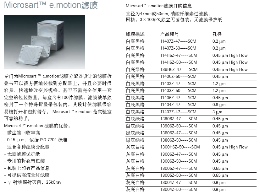 Microsart® e.motion滤膜用于菌落计数、颗粒检测和显微镜方法。适合于Microsart® e.motion滤膜分配器,无菌密封,没有滤膜保护纸,单独密封于一个特殊折叠带包装内,改折叠设计确保了滤膜平整和易于分配。Microsart® e.motion滤膜也可用于Sartorius 吸附垫.